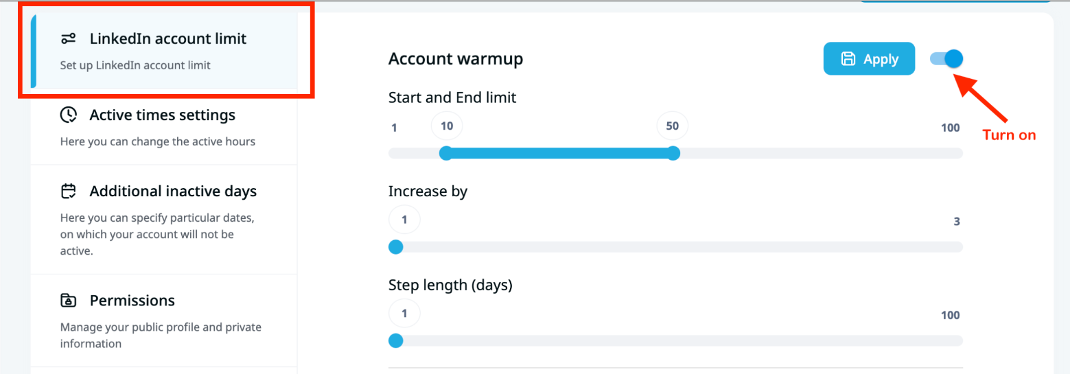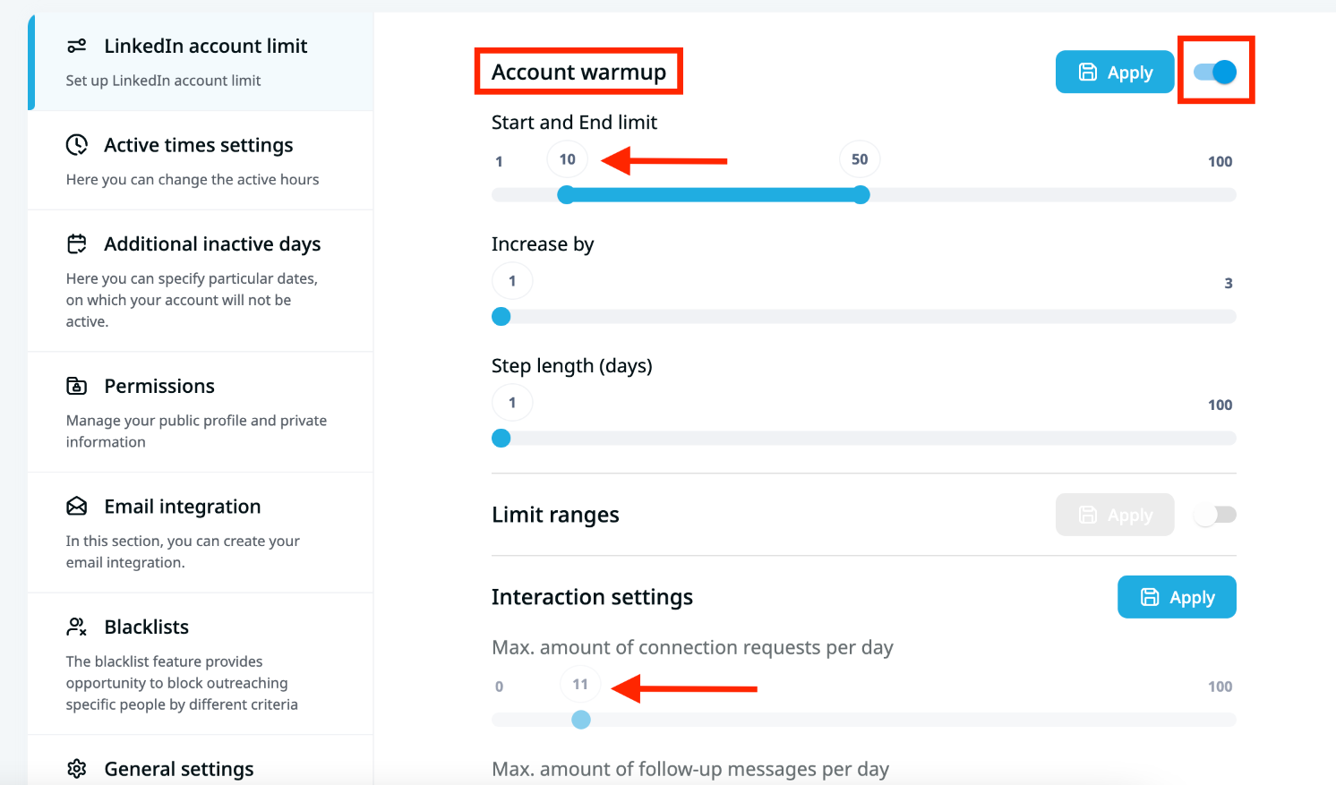 It's important to note that clicking Apply for account warm-up reschedules account tasks and resets the count. In the provided example, if the number has gradually increased to 45 and you apply the settings, the count resets to 10.