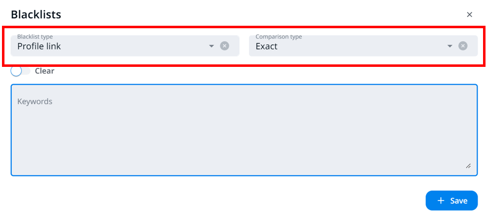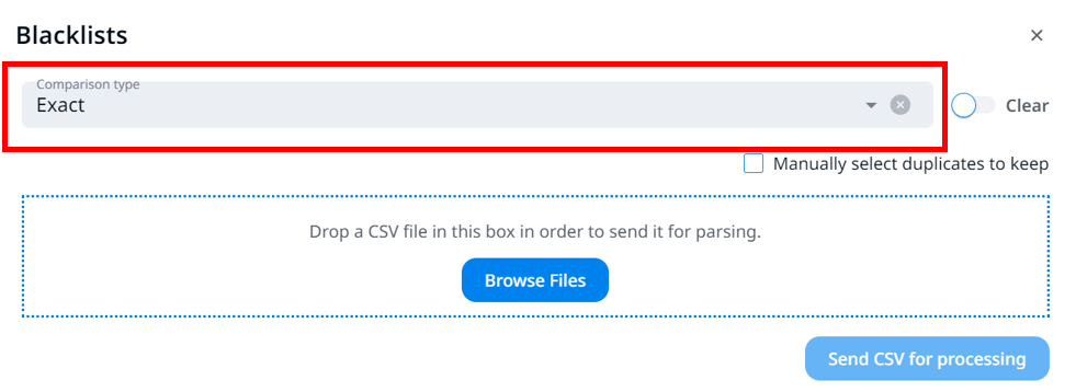 Clear toggle if you want to delete the existing blacklist. To do this, select the comparison type, enable