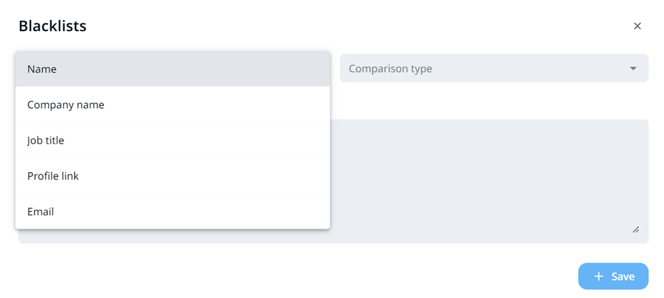 based on the selected blacklist type (e.g., profile link) and comparison type