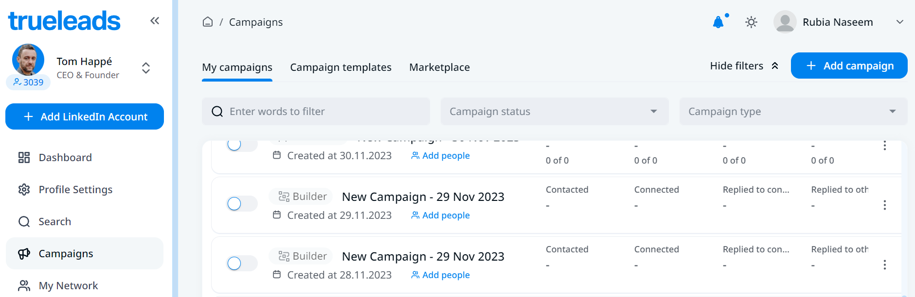 It's important to note that a Connector Campaign is exclusively applicable to individuals with whom you are not currently connected on LinkedIn, specifically targeting your 2nd or 3rd-degree connections. In Trueleads, these connections can be located in the search or my network sections by applying filters based on their status and selecting either Imported or Searched.