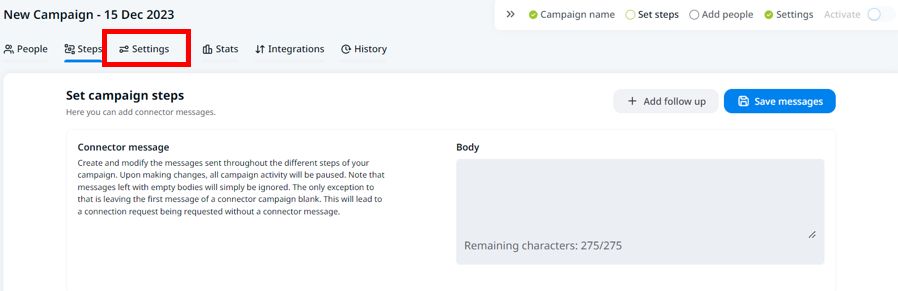 Afterward, access the campaign Settings tab. Adjust the limits for connection requests and messages sent per day for this campaign, and designate the campaign priority. Note that the limits specified in the profile settings must be distributed among all active campaigns in the campaign settings. If you encounter an error message indicating limit exceedance, it signifies incorrect distribution. Refer to additional information here.