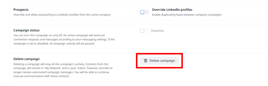 If you intend to outreach the same individuals in the company campaign (with two distinct LinkedIn accounts added under the same company on Trueleads), enable the "Override and allow outreaching to LinkedIn profiles from the same company" toggle in the campaigns under both LinkedIn accounts targeting the same leads.