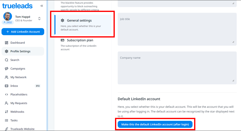 If you handle multiple LinkedIn accounts through a single Trueleads account, you have the option to designate one as the default. This chosen account will automatically be used upon logging in and can be identified by the displayed star. To set a default LinkedIn account on Trueleads, follow these steps: