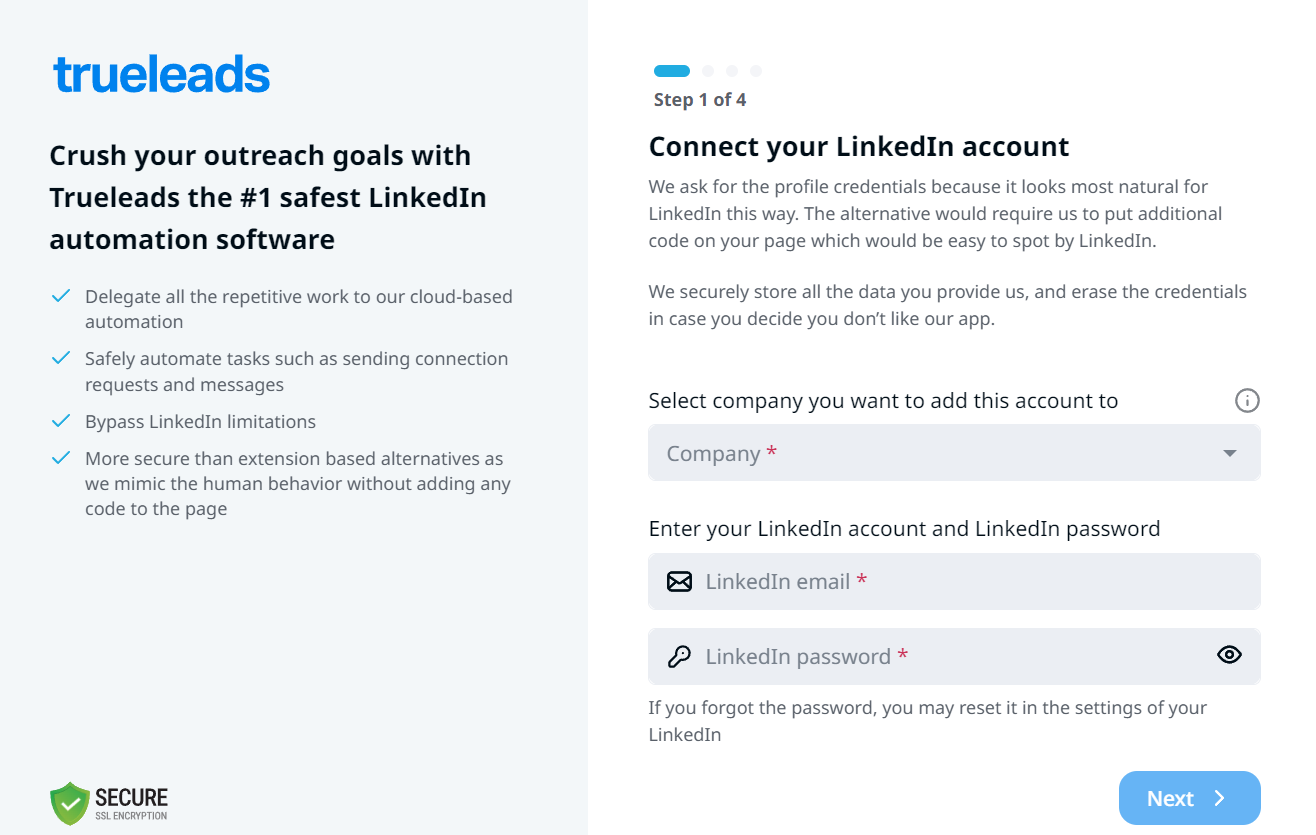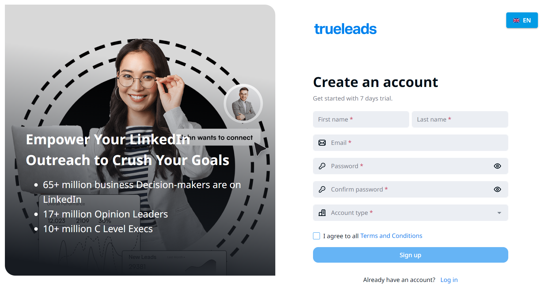 Upon access, connect your LinkedIn account with Trueleads to initiate your complimentary trial and commence your outreach."